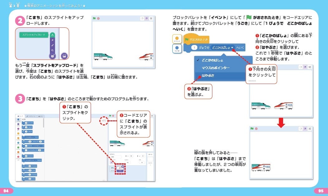 列車旅のストーリーを通してプログラミング的思考を身につけるStep1と、電車のアニメーション作りをするStep2の2部構成。Step2では、小学校のプログラミング教育でも使われる「Scratch(スクラッチ)3.0」の使い方を紹介。購入者特典として「はやぶさ」「こまち」などの電車イラストがダウンロードでき、そのイラストを使って自分が作ったプログラムで動かすことができます。