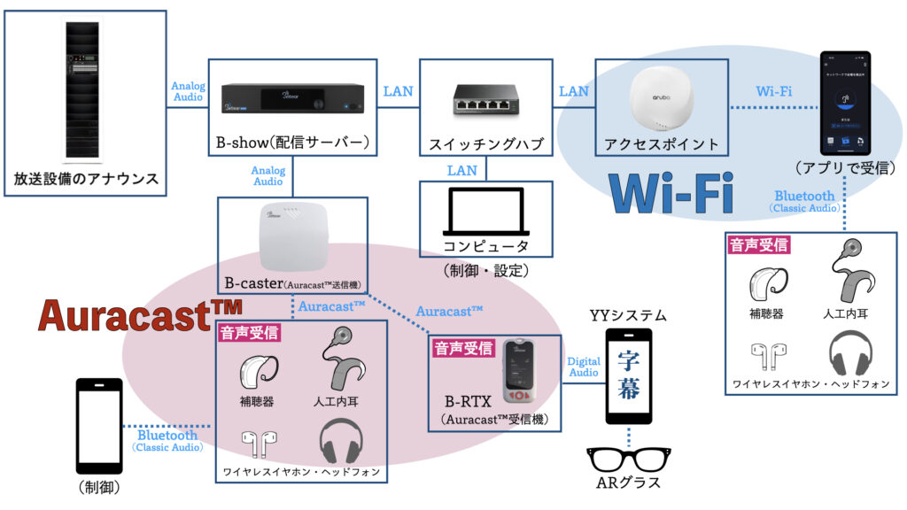 本プロジェクトは、本学メディア学部の吉岡英樹講師(聴覚障害支援メディア研究室)が、こうした公共空間で誰もがアナウンスや情報にアクセスすることができる補聴支援システムの社会実装を目指し取り組んでいるものです。イスラエルBettear社が開発し欧米を中心に60カ国以上で販売(注2)されている最新の補聴技術をベースに、Auracast™とWi-Fiのハイブリッド方式にすることで、現在普及しているほとんどの補聴器や人工内耳、ヘッドフォン等に対応する音声配信システムを構築。従来方式のような専用受信機を必要とせず受信範囲が広いため(注3)、これまで難しかった公共空間でも導入が可能となります。今年の夏から、医療関係者や聴覚障害当事者団体、補聴器や音響機器メーカーなどの協力のもと、全国各地で体験会や試験運用を実施(注4)しています。