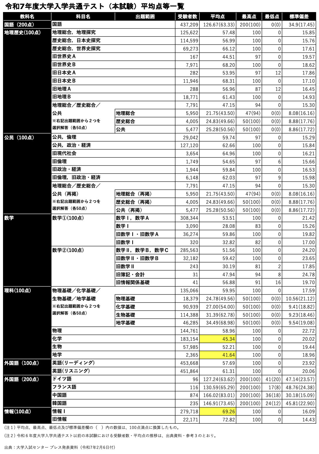 令和7年度大学入学共通テスト(本試験)平均点等一覧(抜粋)